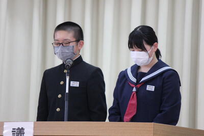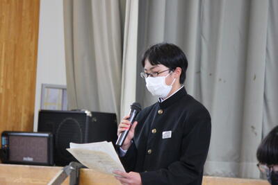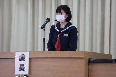 生徒会長あいさつ・年間スローガン発表に続き、各専門委員長から前期活動計画が示されました。その後の質疑応答も堂々と活発に行われ、全校生の総意のもと、自分たちの学校生活をより良いものにしていこうという思いの感じられる総会でした。