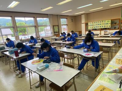 現在美術の授業では、体育フェスティバルに向けて個人うちわを制作しています。