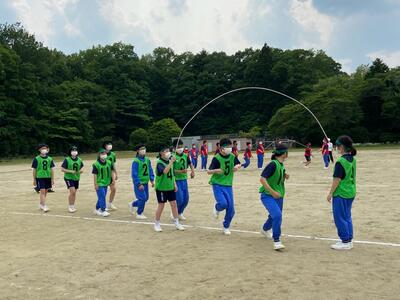 4 【大縄跳び】 3分間で何回跳べるかを競いました。縄を回す人も跳ぶ人も最後はヘトヘト!?