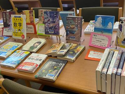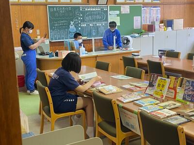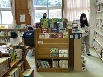 毎週木曜日は、学校司書の水野祐子さんが来校する日です。生徒の皆さんが興味のある本を手に取りやすいよう、書棚の整理をしてくださっています。また、図書ボランティアの齋藤さんが、ブックコートの貼り替えを行ってくれていました。