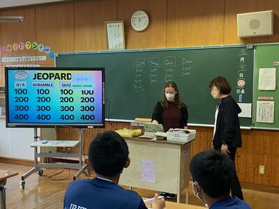 2年生の授業では、2人1組でチームになり、Jeopardyというゲーム形式で重要文型を学習していました。We call him Mario!