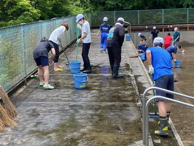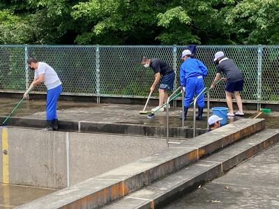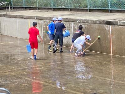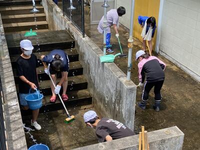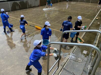 昨日までに大量の枯葉や泥はほぼ取り除いていたので、今日は全校生が協力して(体育フェスティバルのチーム復活!)、プールの底や側面、プールサイドや通路をブラシで磨きあげました。2時間で見違えるようにきれいになりましたが、行き届かなかった部分や頑固な汚れは、保護者の皆様のお力をお借りできればと思います。(PTA奉仕作業、お世話になります。)
