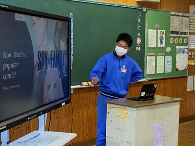 2年生が、自分の好きな漫画やアニメについて、I think …… Because ……を用いてプレゼンテーションをするのを、1年生が参観しています。