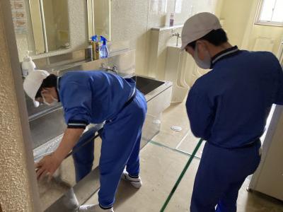 掃き掃除と手洗い場に分かれて、効率よく清掃していきます。