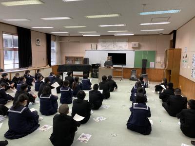 およそ15分ほどのお話でしたが、災害の悲惨さ、亡くなった家族の悲しみ、この年齢だからわかる初めて理解できること、語り継いでいくことの大切さなど、様々な事を知ることができました。生徒たちにとっては貴重な機会となりました。
