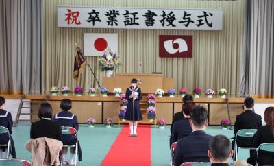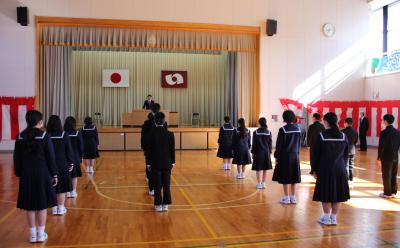 PTA会長様、同窓会長様、入遠野小学校長様を来賓にお迎えし、第74回卒業証書授与式が行われました。3年生はその歩き方、返事、証書授与、どれをとっても今までで一番立派な姿でした。特に全校生で歌う式歌は、体育館全体にハーモニーが響き渡り、入中生が1つになった瞬間でした。