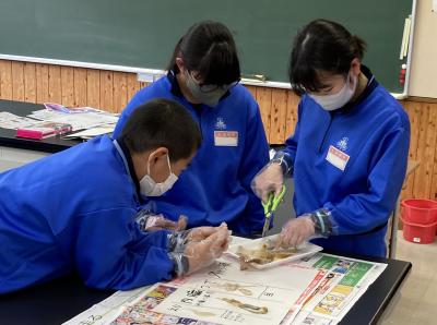 理科では、イカを教材に、無セキツイ動物の体のつくりを学習しました。生のイカにさわるのに慣れていない生徒が多く、始めはおっかなびっくりでしたが、だんだんと体のつくりに興味を惹かれていました。解剖してひとつひとつを丁寧に見ていくと、いろいろな発見があったようです。