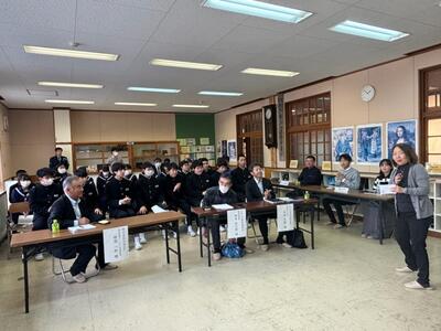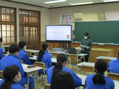 12月14日(木) 6校時目に「がん教育」の講話がありました。中学生では、「がん」という病気を意識している人は少ないと思いますが、常磐・遠野地区保健福祉センター山岡さんの話を真剣に聞き、正しい知識と予防について学びました。将来に向けて、あるいは家族に対して、役立ててほしいと思います。