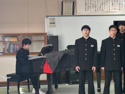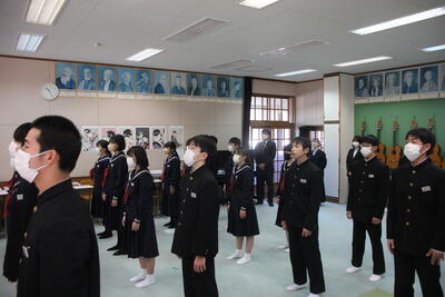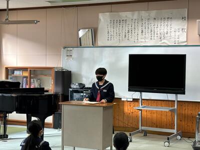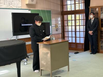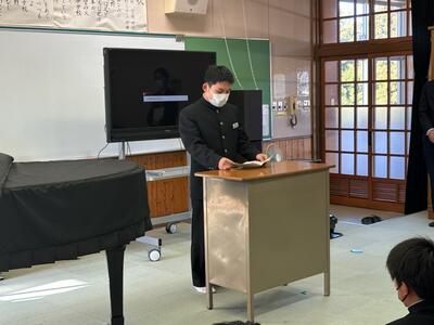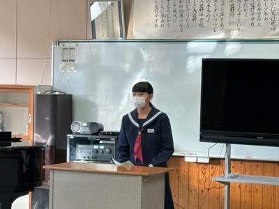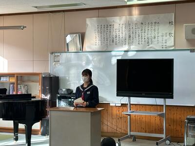 愛校清掃で普段よりも時間をかけて校舎内を隅々まで清掃した後、音楽室で終業式を行いました。式の後には、代表生徒の発表により、長かった2学期を振り返りました。どの学年も、充実した学校生活を送り、自分たちの成長を実感することができていたことを、大変嬉しく思います。