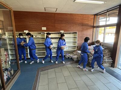 閉校に向けて処分するものが多く大量の古紙が出たため、1・2年生に搬出作業を手伝ってもらいました。バケツリレー方式であっという間に運び出し完了です。大変助かりました。
