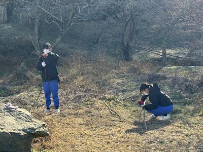 遠野オートキャンプ場長の櫛田さんにご指導いただきながら、班ごとに協力し、「楮を刈る→刈った楮の枝を切る→一定の太さ以上の楮を麻縄で束ねる」、という一連の作業を行いました。動いていると汗ばむぐらいの晴天に恵まれ、生徒たちは笑顔で声をかけ合いながら作業を進めていました。