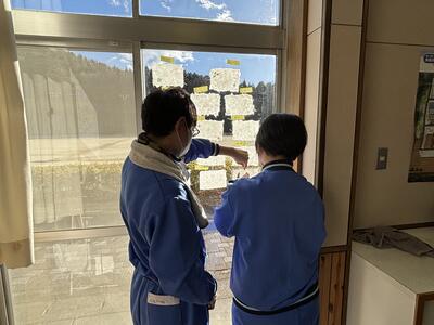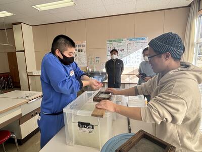 まず始めに、遠野紙子屋の平山さんから、遠野和紙作りの工程等について教えていただきました。その後、和紙を飾る色紙を準備してから、いよいよ紙漉きです。水に繊維状になった楮とトロロアオイから採った粘液を混ぜ合わせたものを、型の中で数回揺らして水分を落とした後、型から外し、水分を飛ばしてから窓ガラスへ貼り付けました。このまま天日で完全に乾燥するのを待ちます。
