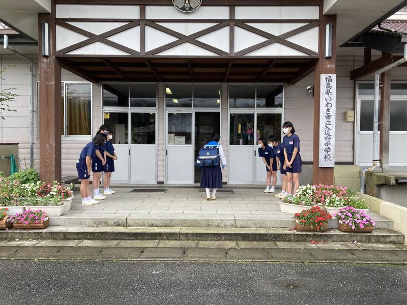 昇降口では、女子生徒があいさつ運動をしていました。普段は制服で行っていますが、現在は暑さ対策のためジャージでも行っています。マスクをしていますが、お互い明るく元気な声が響いています。曇天が続いていますが、生徒たちの声は晴れ晴れと元気いっぱいです!