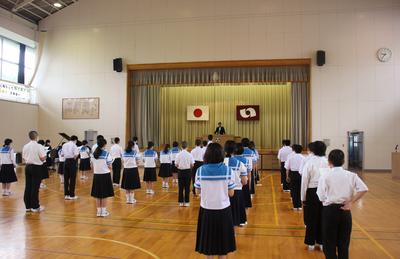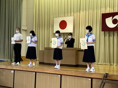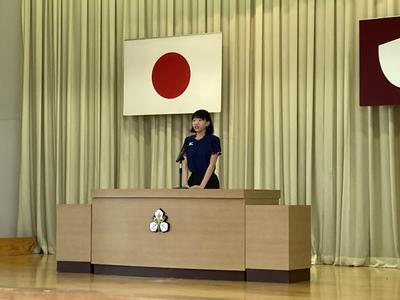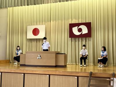 生徒会「1学期は、ワンストップ礼の実践やあいさつができていた。また、いろいろなことに挑戦することもできた。夏休みは規則正しく健康に過ごし、2学期良いスタートを切れるようにしましょう。」