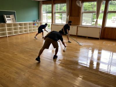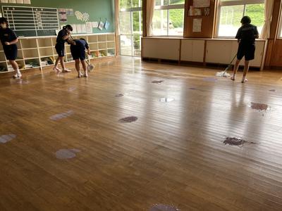 1学期終業式の後、全校生で美化作業とワックスがけを行いました。一人一人が一生懸命清掃に取り組みました。1年生の中には、ワックスがけの最中も自分で仕事を探して窓の細かな部分まで埃を拭き取る生徒もいました。