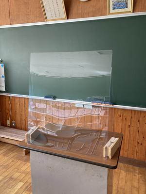 感染症予防対策として、透明のパーティションを教卓に設置しました。これは市教委から配付されたものです。(入中では、木材を土台につけて転倒防止対策をしてあります。)