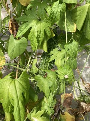 3年生教室前のグリーンカーテンは、用務員さんのご協力で盛大に葉を広げています。隙間を覗くと、ゴーヤーが実をつけていました。気分的にも和み、良い雰囲気で頑張れそうです。