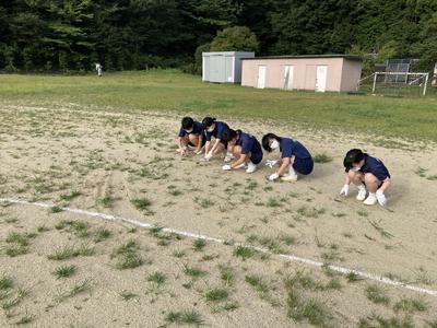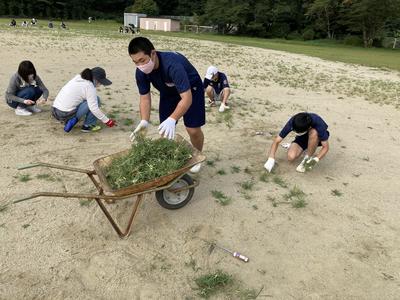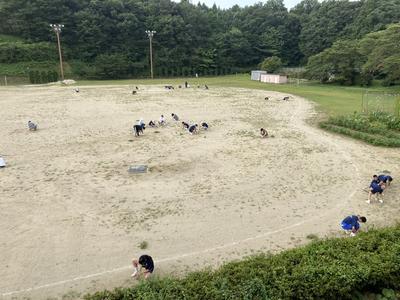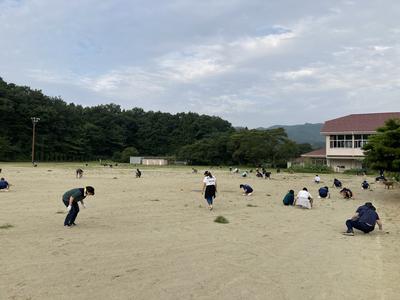 校庭周りも、自前の草刈り機でお父さん方や用務員さんが草を刈ってくれました。また、卒業生が何人か手伝いに来てくれました。今年は新型コロナウイルス感染症の影響で地域の参加を見合わせましたが、毎年卒業生が来てくれるというのは素晴らしいのと同時に学校にとってとてもありがたいことです。
