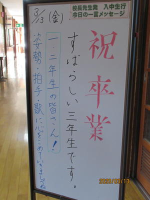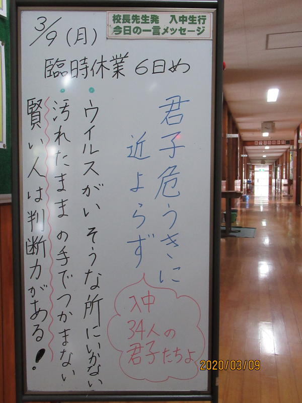 3月7日(土)、県及び市から「いわき市において、県内初となる新型コロナウイルス感染症の患者が確認された」との発表がありました。いわき市において確認された事例は、感染経路が明らかで、保健所の健康フォローアップの下で発症が確認されており、他への感染リスクが最小限であると考えられます。本校としましては、現時点においては、過日のお知らせのとおり感染防止対策を徹底した上で、卒業式を実施いたします。なお、今後、状況等に変化がある場合には、改めてご連絡いたします。