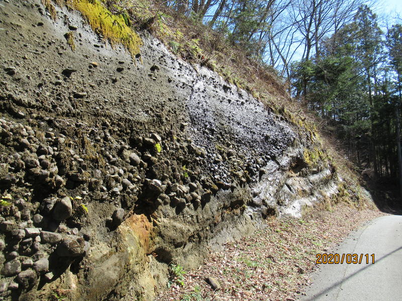 ここは冷水に抜ける切通しの地層です。中学2年生は小学生の時に見学しましたね。鉱物からこの辺りが海底にあったことがわかるそうです。ロマンがありますね。