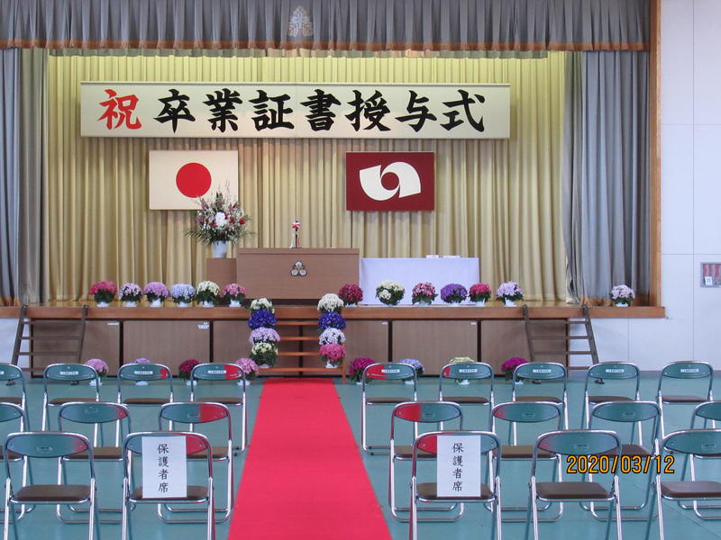 最終点検を終えて会場が出来上がりました。卒業生の皆さん、在校生の皆さん、明日元気に登校してきてください。