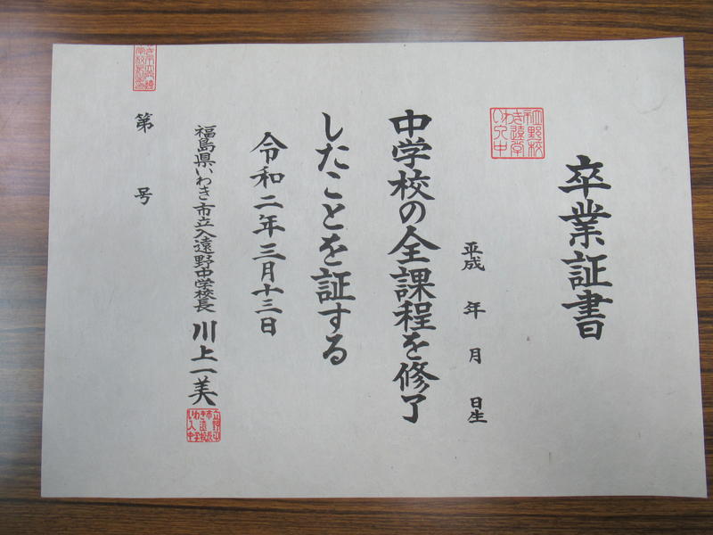明日卒業生に渡す遠野和紙の暖かな色合い手触りがとてもよい卒業証書です。