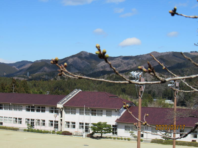 晴れ渡る空の下、桜のつぼみも膨らんできています。往生山もきれいに見えていますよ。