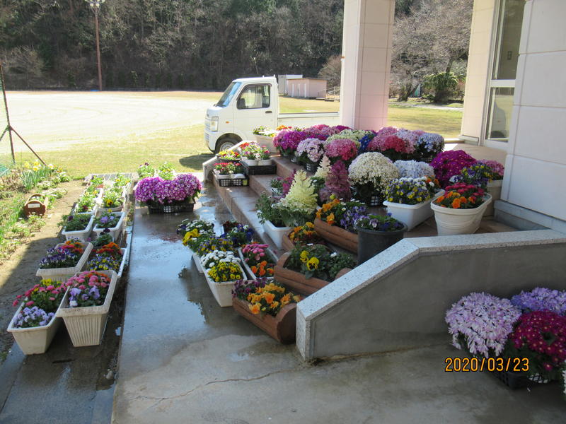 入中体育館前はさながら、花屋さんのようです。日光浴をさせて、水を与え、用務員さんが丁寧にお世話をしてくれています。