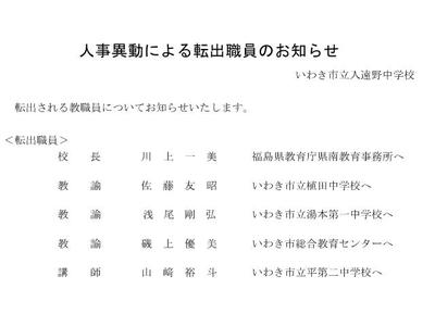 令和6年4月1日、遠野地区の学校再編により、上遠野中学校、入遠野中学校が1つになり、「いわき市立遠野中学校」となりました。