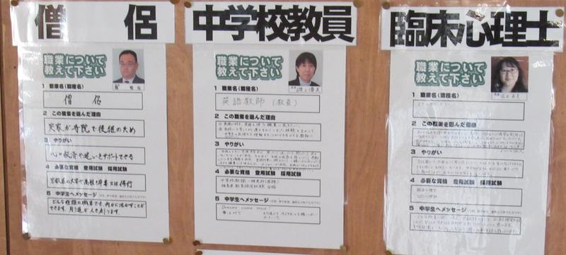 入中廊下の「職業教えて!」コーナーに、「臨床心理士」「中学校教員」「僧侶」を追加掲示しました。