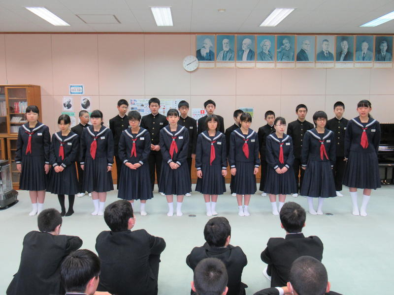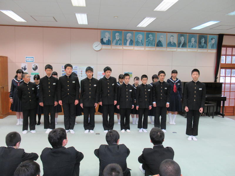 生徒会長から、激励の言葉そして全員で伝統ある入中校歌を元気に歌いました。