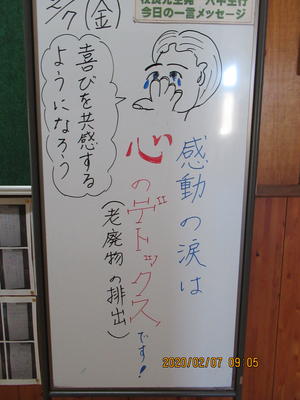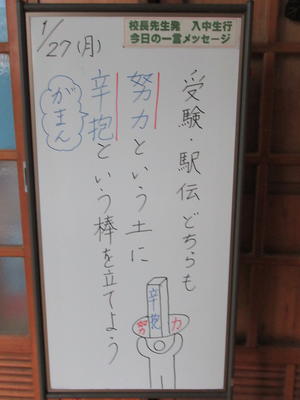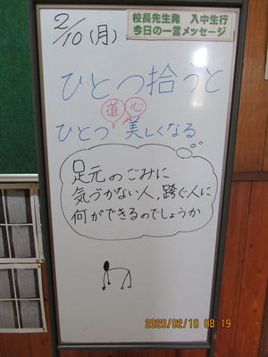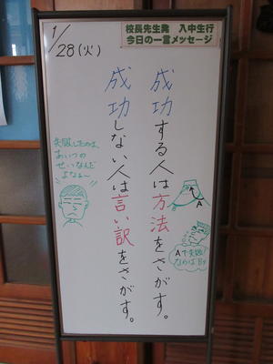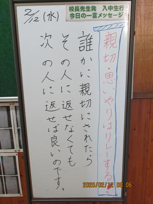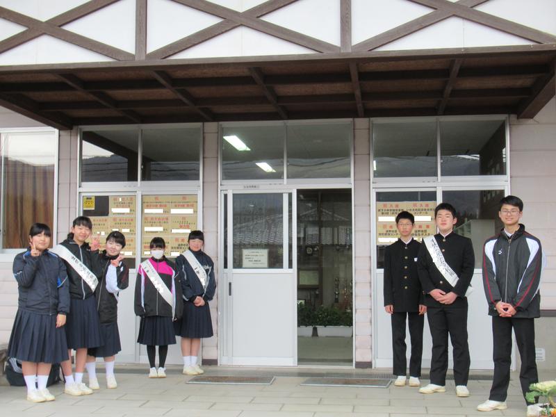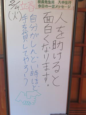 冷たい強風が肌を刺す朝でした。入遠野でもとんできた雪がうっすらと残っていました。ただ今いわき市は(風雪乾燥低温注意報が出ています)寒風が向かい風できても、入中生は元気にあいさつを交わし、さあ今日もはりきっていこう!と笑顔いっぱいで一日のスタートです。今日は午後から新入生入学説明会があります。