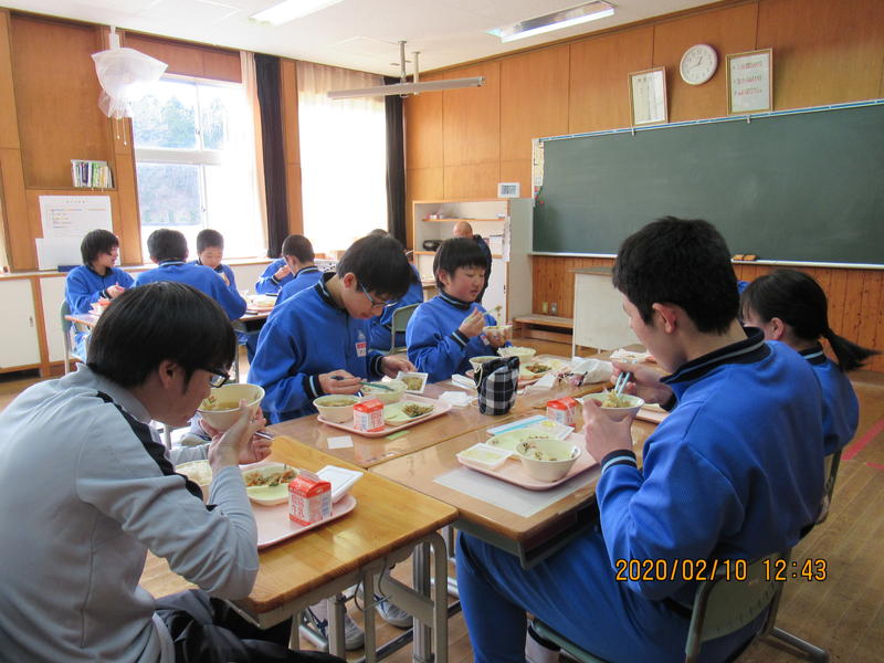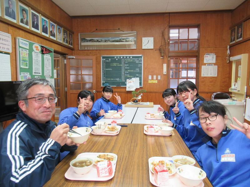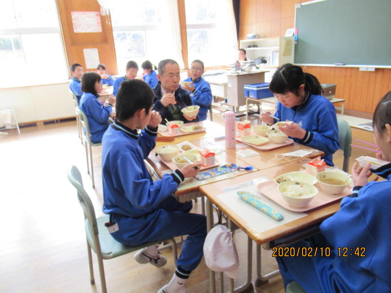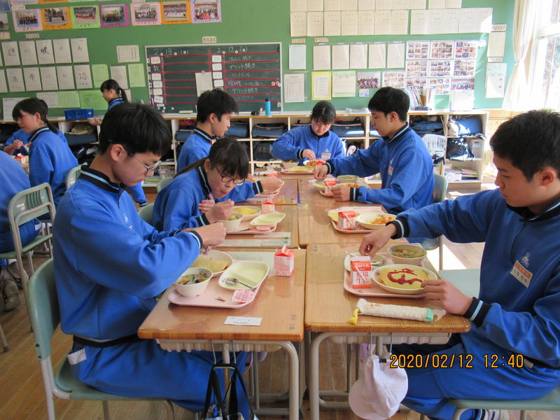 今日は和食献立。級友と会話をしながら給食を楽しんでいます。笑顔があると旨みを感じやすいそうです。