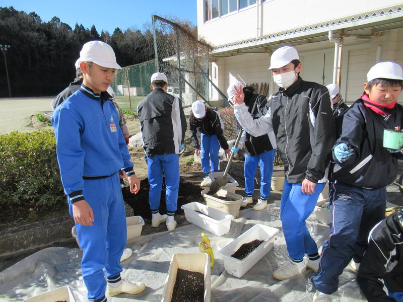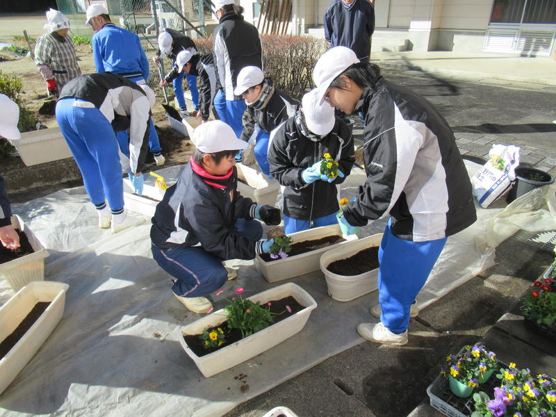 栽培の学習です。プランターに、デージーとパンジーの植え付けをしました。苗を取り出し、根が張った底の部分に穴を開け、新しく丈夫な根が張れるようにします。一つ一つ意味にある作業を体験することは将来に役立ちますね。