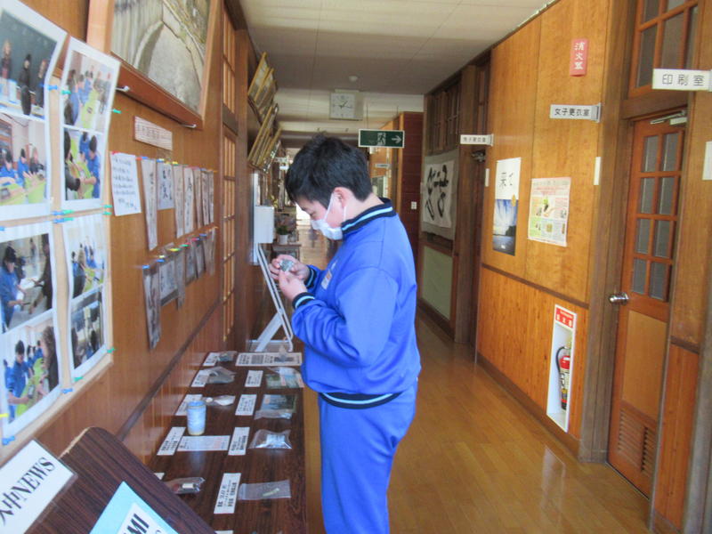 校長室前に、鉄鉱石・石炭・黒鉱(一つの岩石に金、銀、銅などが混在している)・原油など少し珍しい資料が展示されており、生徒は自由に手に取ったりにおいを嗅いだりして触れることができます。