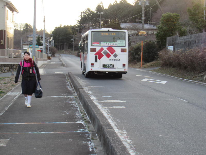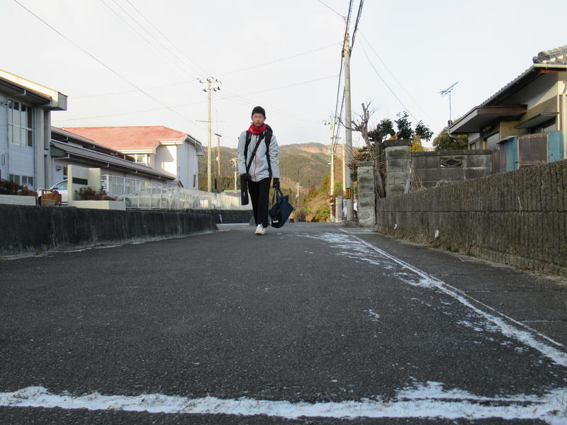 朝の登校風景です。学校前の横断歩道付近は昨日に引き続き凍っていました。