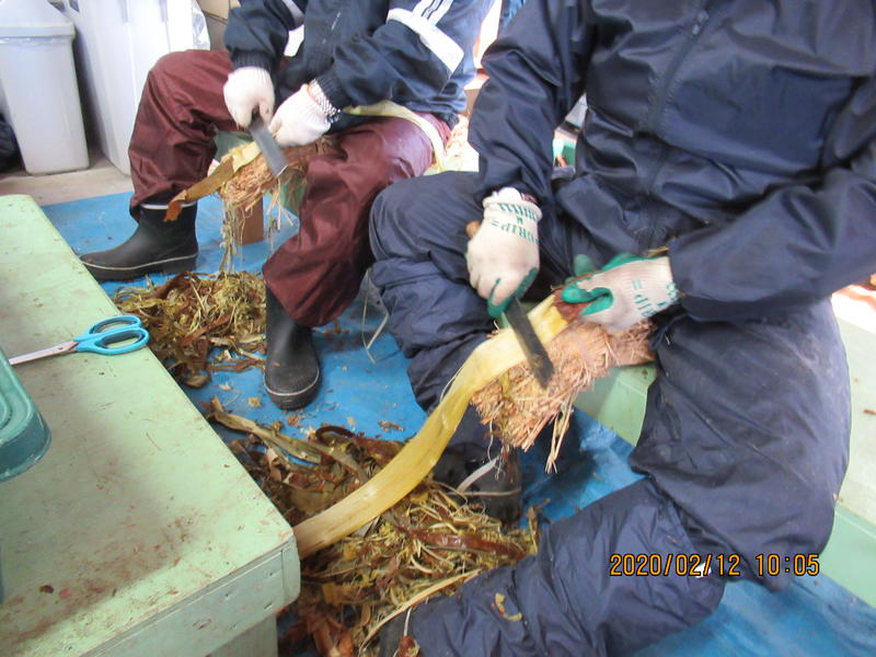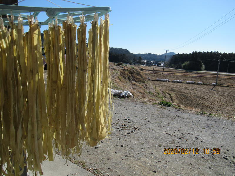 2020年2月12日 17時57分入中で刈り取った楮は現在「遠野工房」で加工されています。①楮を煮る ②表皮をはぐ ③干す