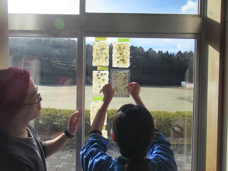 遠野和紙の歴史、特徴、原料(実物)について話を聞いた後に、いざ実習。思い思いに色紙をちりばめたり、入中もみじを入れたりして、紙をすき、しばらく窓ガラスに貼り付けて乾燥させます。天気が良ければ来週月曜日あたりにはできあがるようです。