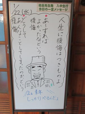 校長先生のお話 ①目標は見えるところに書いておこう ②オリンピック選手と同じ3年生、病気にならないよう進路目標達成(金メダル)に向けて励んでいる真っ最中、③心構えはいつでも変えられる ④1,2年生は50日 3年生は45日の授業日です、一日一日を大切にしよう。