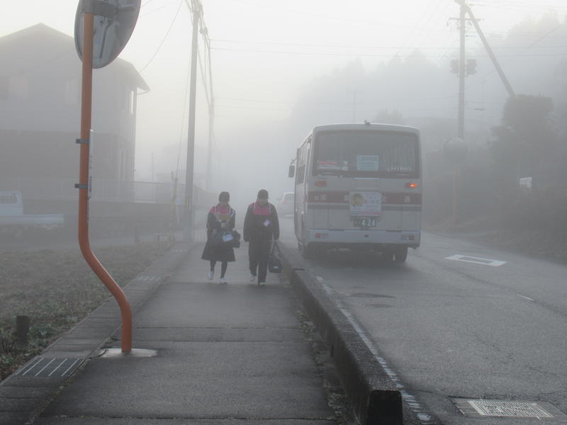 入中にはどの方角から来ても坂を登ってきます。入遠野は霧に包まれた朝でした。バスを降りた生徒が霧の中から姿を現し学校へ向かってきます。「おはよう~!さあ金曜日、今日も元気に行こう。」といつもの一言。「はい!」と明るく声が返ってきます。気持ちいいですね。