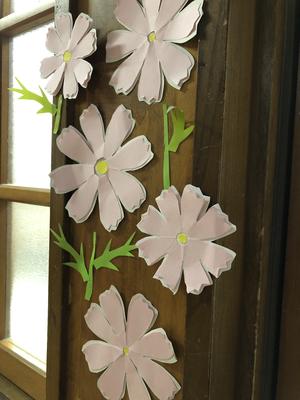 図書室の入口には、きれいなコスモスが咲いています。(学校司書さんの作品です)