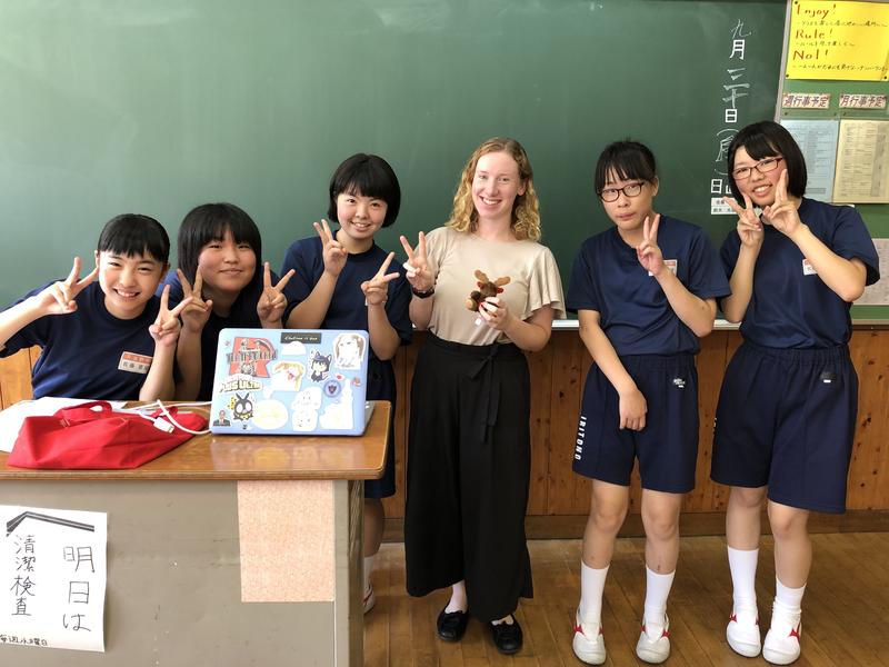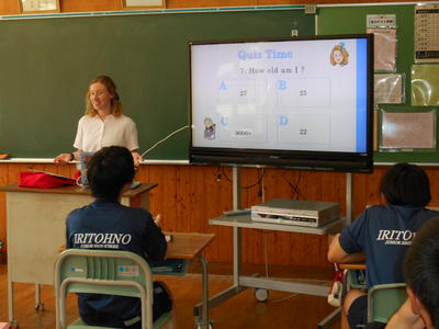 シドニー先生(ALT)の授業です。出身地はBrace bridge(カナダのトロント市の近く)、好きな色はyellow、好きな映画は Your name(君の名は)、年齢は22歳などクイズで生徒とやりとりをしていました。