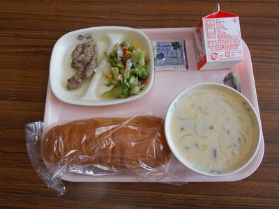 コッペパン、ブルーベリージャム、鶏肉のバジル焼き、イタリアンサラダ、コーンクリームスープ(813kcal)