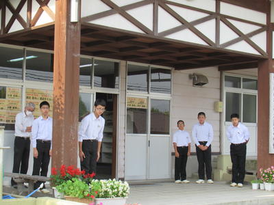 正門前と生徒昇降口の2箇所であいさつ運動を行っています。県道沿いでは運転手の皆さんも車内からあいさつを返していただき、生徒もすがすがしく嬉しい気持ちになります。入中生はワンストップ礼の励行にも取り組んでいます。