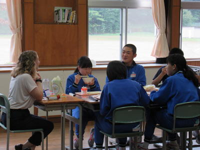 ALTのシドニー先生が今日は2年生とランチをとっています。積極的に話しかける生徒が多くシドニー先生もほめていました。
