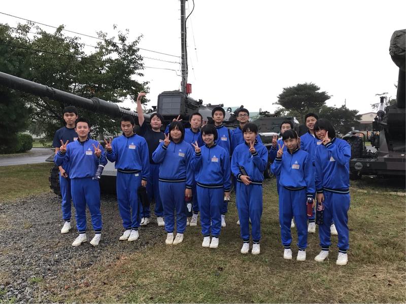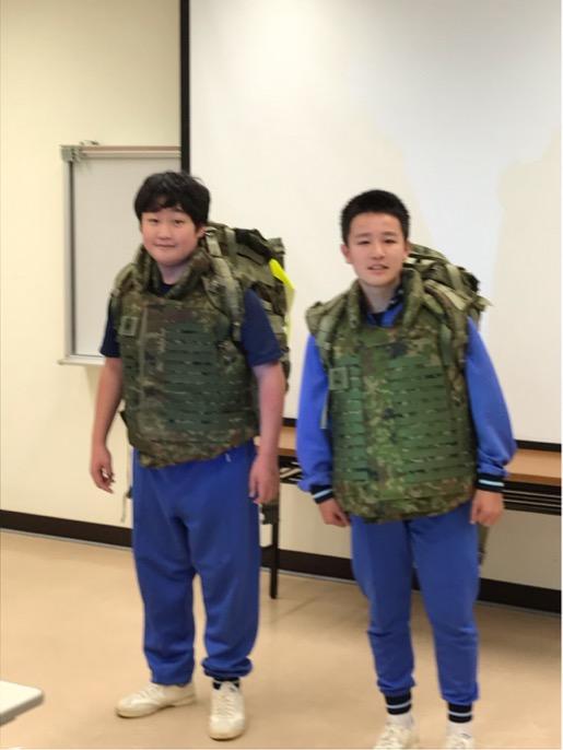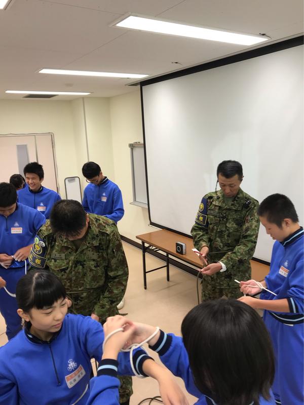 陸上自衛隊郡山駐屯地に来ています。駐屯地の説明を受け、ロープワーク体験、隊列、食堂で昼食をとりました。装備品リックは想像以上の重さでした。