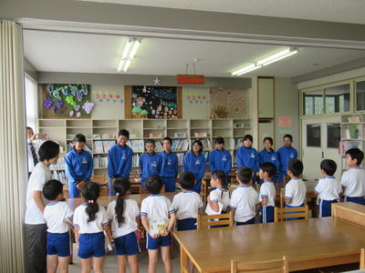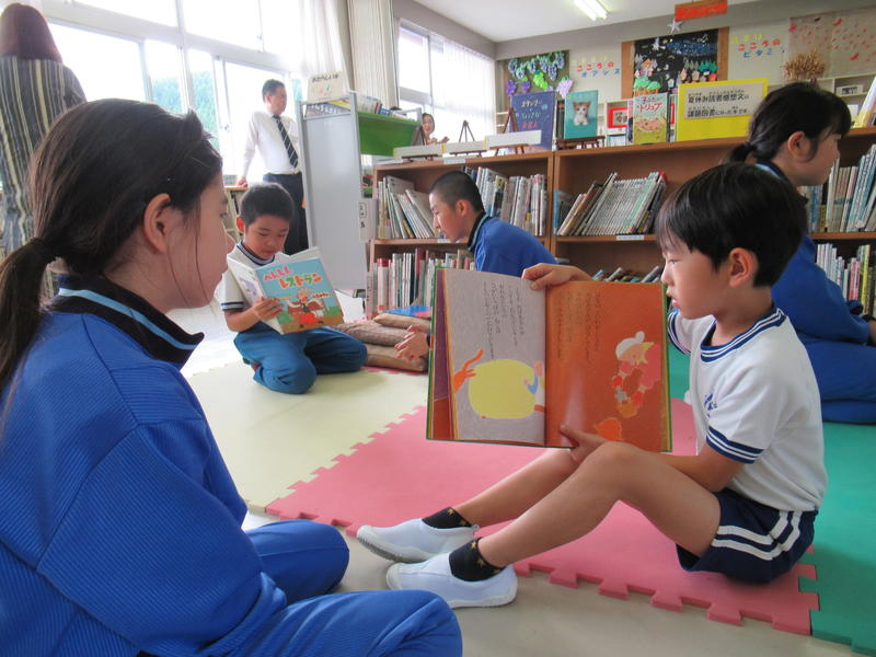 まずは、中1のお兄さん、お姉さんが小1の子どもたちに絵本の読み聞かせをしました。