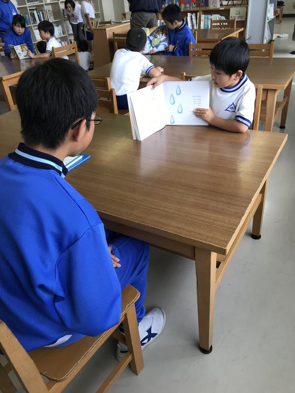 小1生は別の中1生に所へ移動。中1生も同じ本を先ほどとは別の小1生に読んであげます。回を増す毎に声の大きさや発音もはっきりして、お互いに目を合わせ間をとりながらよむこともできるようになります。