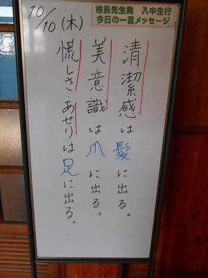 日替わりで、生徒昇降口に「校長先生発 入中生行メッセージ」を書いています。今日は3つの「つ」についてです。