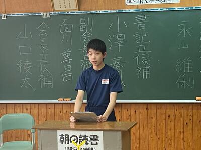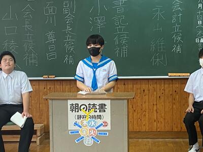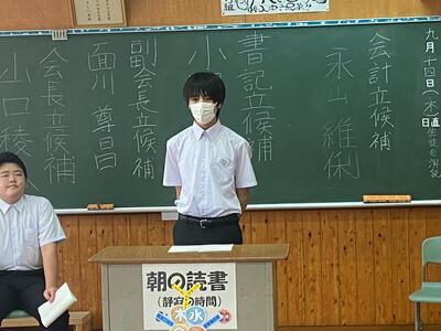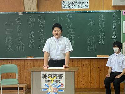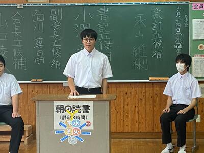 本日6校時に、後期生徒会役員選挙立会演説会を行いました。